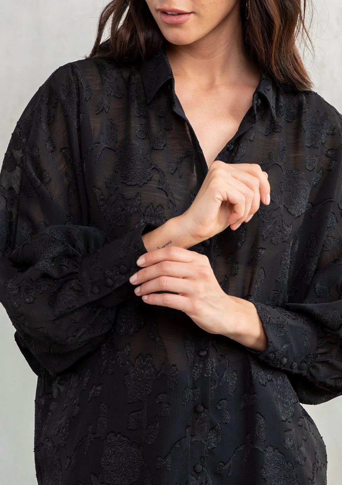 Jacquard chiffon, dolman sleeve blouse. Buttons up the front.
